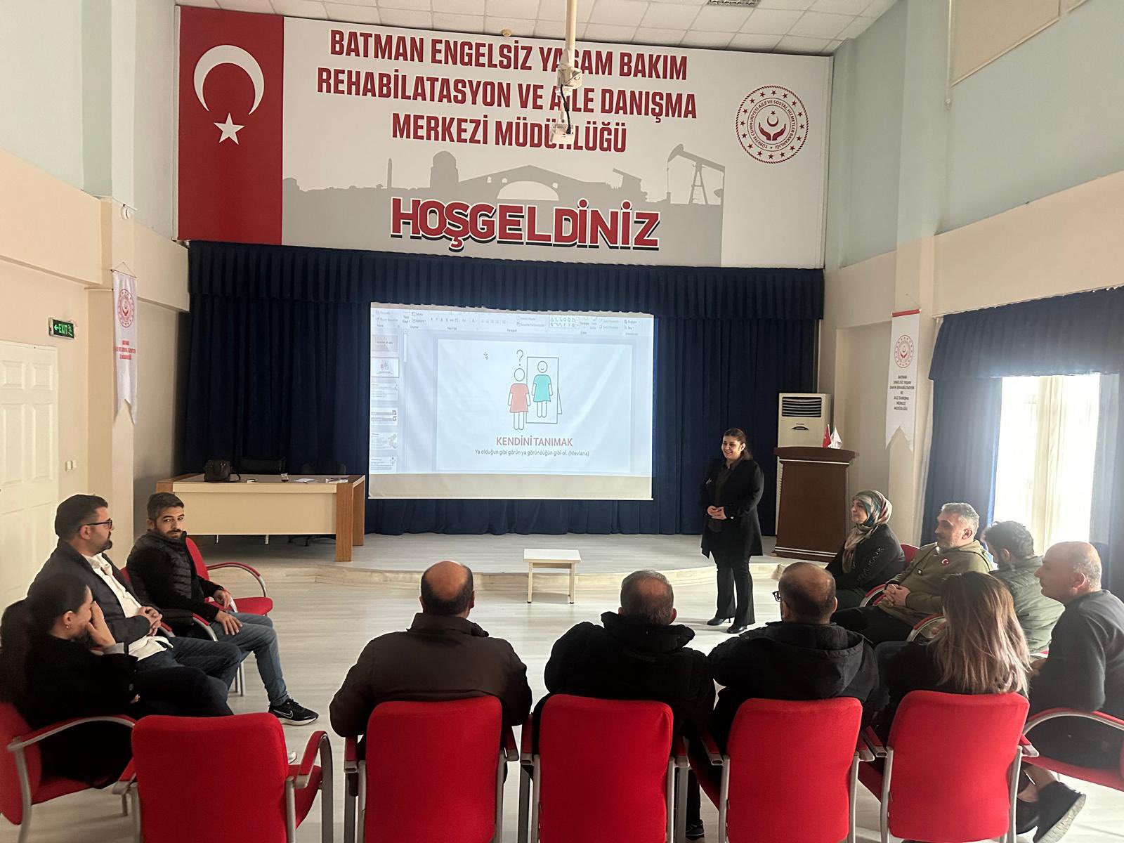 İl Müdürlüğümüze bağlı Batman Sosyal Hizmet Merkezi Müdürlüğü Eğitim ve Danışmanlık Birimi tarafından Batman Engelsiz Yaşam Bakım Rehabilitasyon ve Aile Danışma Merkezi Müdürlüğü personellerine Modüler Aile Eğitim Programı tanıtımı yapılarak “Kendini Bilmek” konulu eğitim verildi