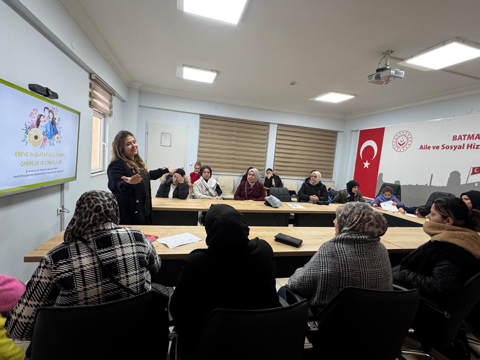 İl Müdürlüğümüze bağlı Batman Sosyal Hizmet Merkezi Müdürlüğü Eğitim ve Danışmanlık Birimi, sosyal hizmet modellerinden olan Sosyal Ekonomik Destek hizmetinden faydalanan ailelere Modüler Aile Eğitim Programı kapsamında “Olumlu Ebeveynlik Becerileri” konulu eğitim verdi.