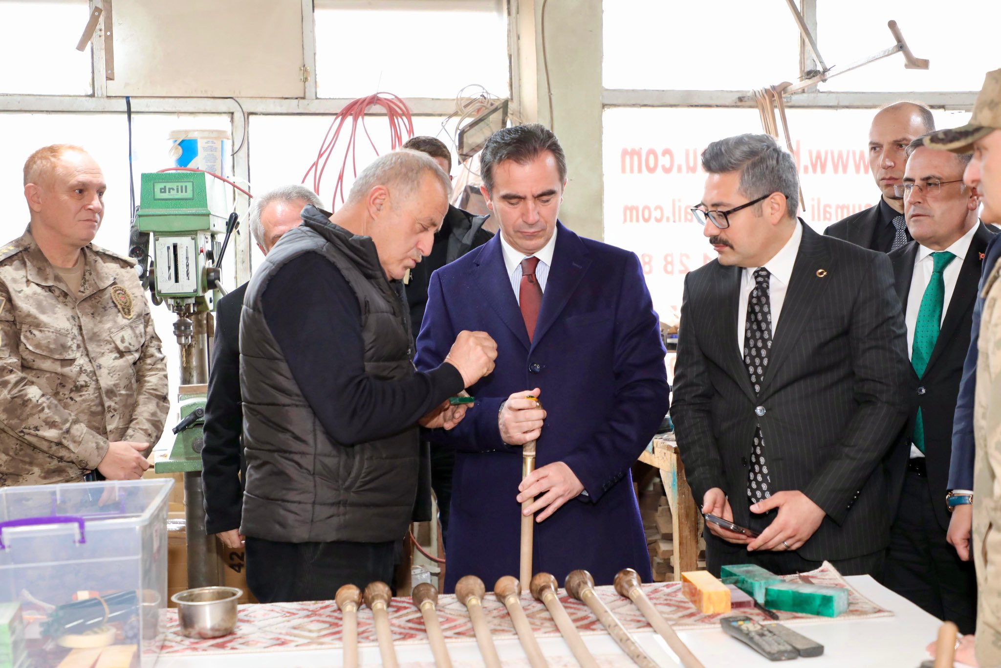 Asırlık ceviz ağaçları ile sığır ve koç boynuzu kullanarak bastonları ustalıkla işleyip birer sanat eserine dönüştüren ve “Cumhurbaşkanlığımızca Yaşayan İnsan Hazinesi” ödüllü Cumali Birol, geleneksel el sanatlarımızı yaşatmaya devam ediyor. Baston yapım süreci hakkında kendisinden bilgi alan Sayın Valimiz, ilimizin tanıtımına sağladığı katkılardan dolayı teşekkür etti ve çalışmalarında başarılar diledi. Ziyarete, Adilcevaz Kaymakamı Sayın Nurhalil Özçelik, İl Jandarma Komutanı Sayın Tuğgeneral Barış Soyal, İl Emniyet Müdürü Sayın Koray Şensoy, Adilcevaz Belediye Başkanı Sayın Av. Abdullah Akbaba, DAKA Bitlis Yatırım Destek Ofisi Koordinatörü Sayın Nurettin Polat, İl Tarım ve Orman Müdürü Sayın Ramazan Çolak, Aile ve Sosyal Hizmetler İl Müdürümüz Vefa Akdoğan, İl Müftüsü Sayın Kadir Koçak ile Aydınlar Belde Belediye Başkanı Sayın İbrahim Ergün eşlik etti.