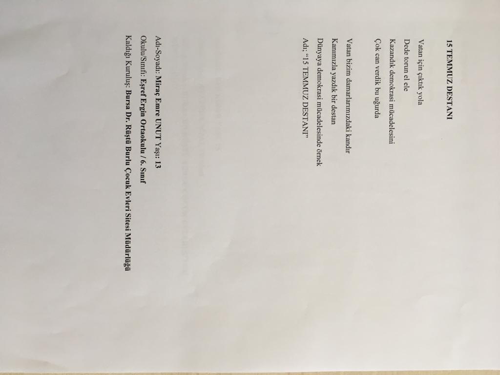 Aile, Çalışma ve Sosyal Hizmetler Bakanlığımızca kuruluşlarımızda bulunan personelimiz, 14 yaş ve üzeri gençlerimiz, huzurevlerinde kalan yaşlılarımız ve kadınlarımız arasında 15 Temmuz temalı resim ve şiir yarışmalarının değerlendirmeleri kurulan komisyon tarafından gerçekleştirildi.