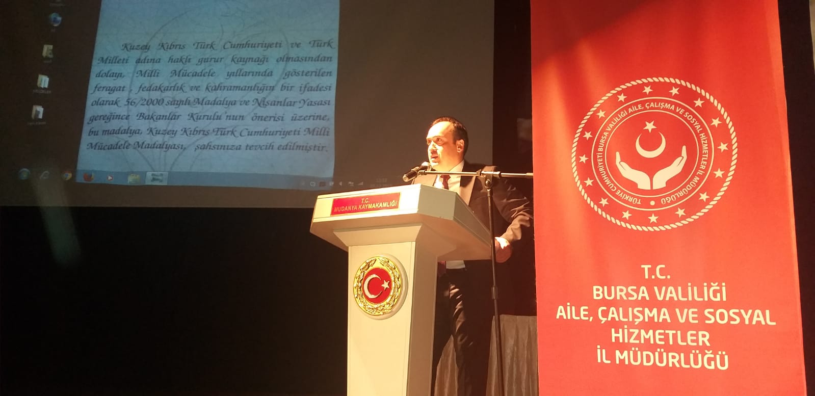 Mudanya Kaymakamı Faik Oktay SÖZER’ in başkanlığında İlçe Jandarma Komutanı, İlçe Emniyet Müdürü, Mudanya Belediye Başkanı Hayri TÜRKYILMAZ, İlçe Milli Eğitim Müdürü, İl Müdür Yardımcımız Fikrîye AYDIN, Şehit Yakınları ve Gaziler Birimi Personelimiz, Bursa Muharip Gaziler Dernek Başkanı Muzaffer UYAR’ ın katılımıyla 46 Kıbrıs gazimize Milli Mücadele Madalyası ve Beratı takdim edildi.