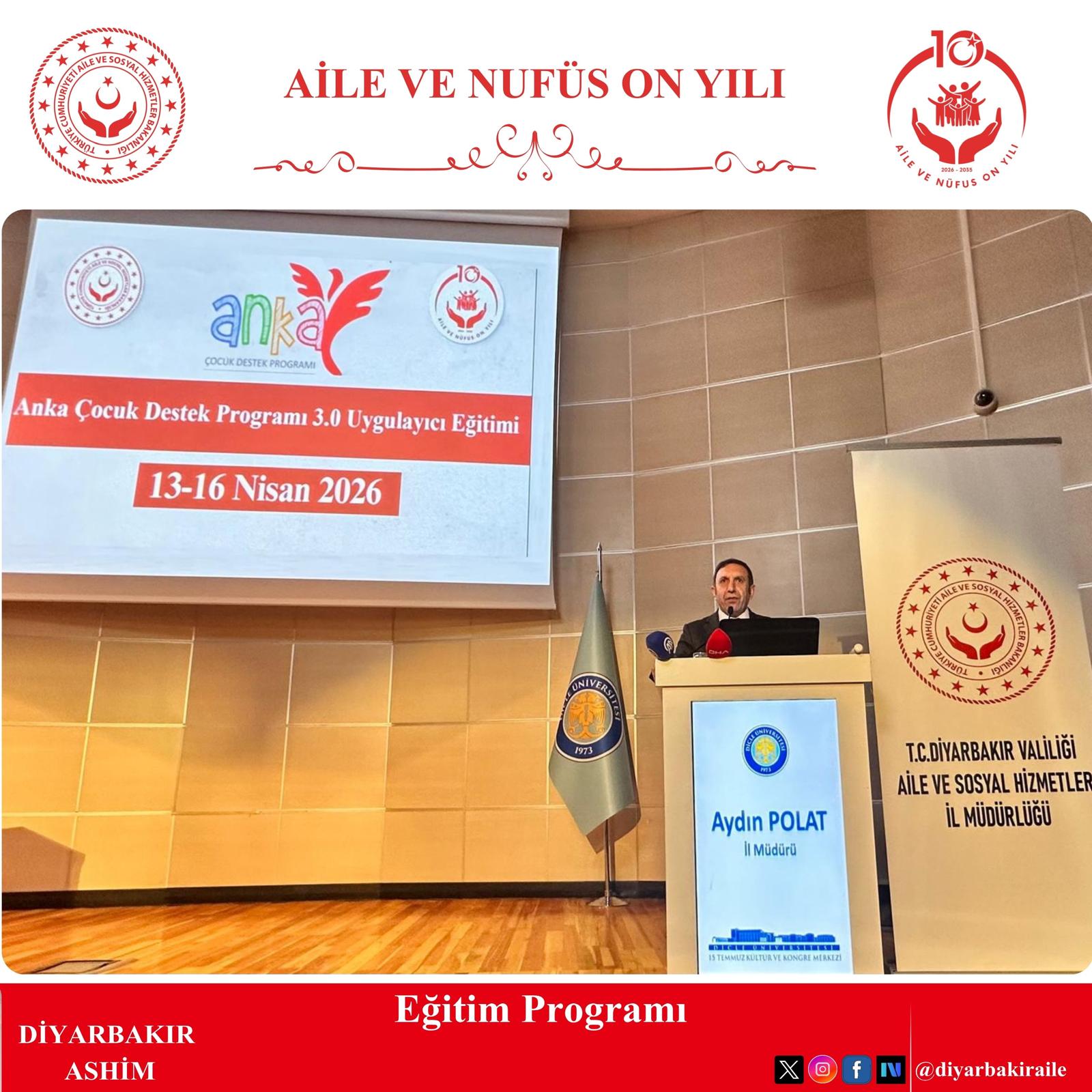 Dicle Üniversitesi 15 Temmuz Kültür ve Kongre Merkezi Orhan Asena Konferans Salonu’nda düzenlenen ANKA Psiko-Sosyal Çocuk Destek Programı eğitimi, İl Müdürümüz Sayın Aydın Polat’ın açılış konuşmalarıyla başlamıştır.