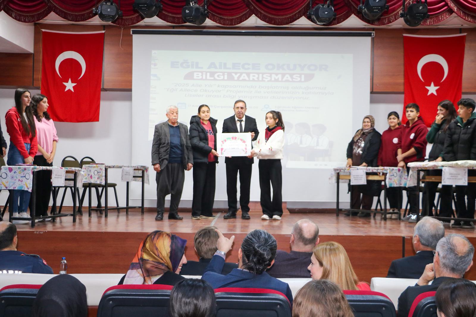 2025 Aile Yılı kapsamında Eğil ilçemizde, liseli öğrencilerimize yönelik olarak yürütülen “Eğil Ailece Okuyor” projesi çerçevesinde düzenlenen Liseler Arası Bilgi Yarışması gerçekleştirildi.