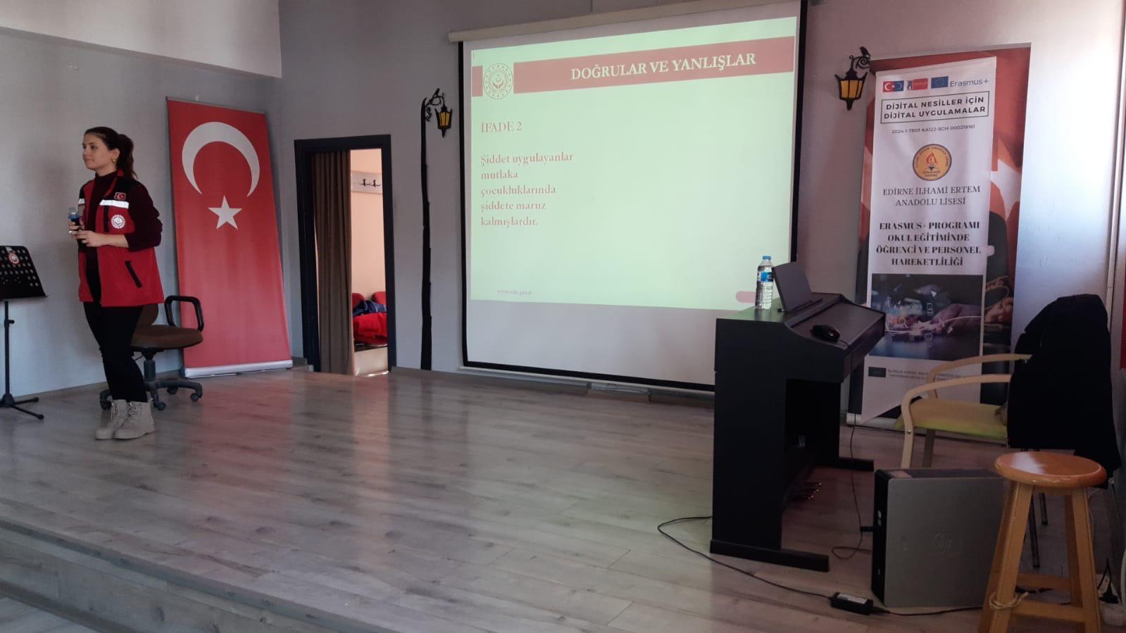 Edirne Aile ve Sosyal Hizmetler İl Müdürlüğüne bağlı Şiddet Önleme ve İzleme Merkezi Müdürlüğünce İlhami Ertem Anadolu Lisesi öğrencilerine Kadına Yönelik Şiddetle Mücadele eğitimi verildi.