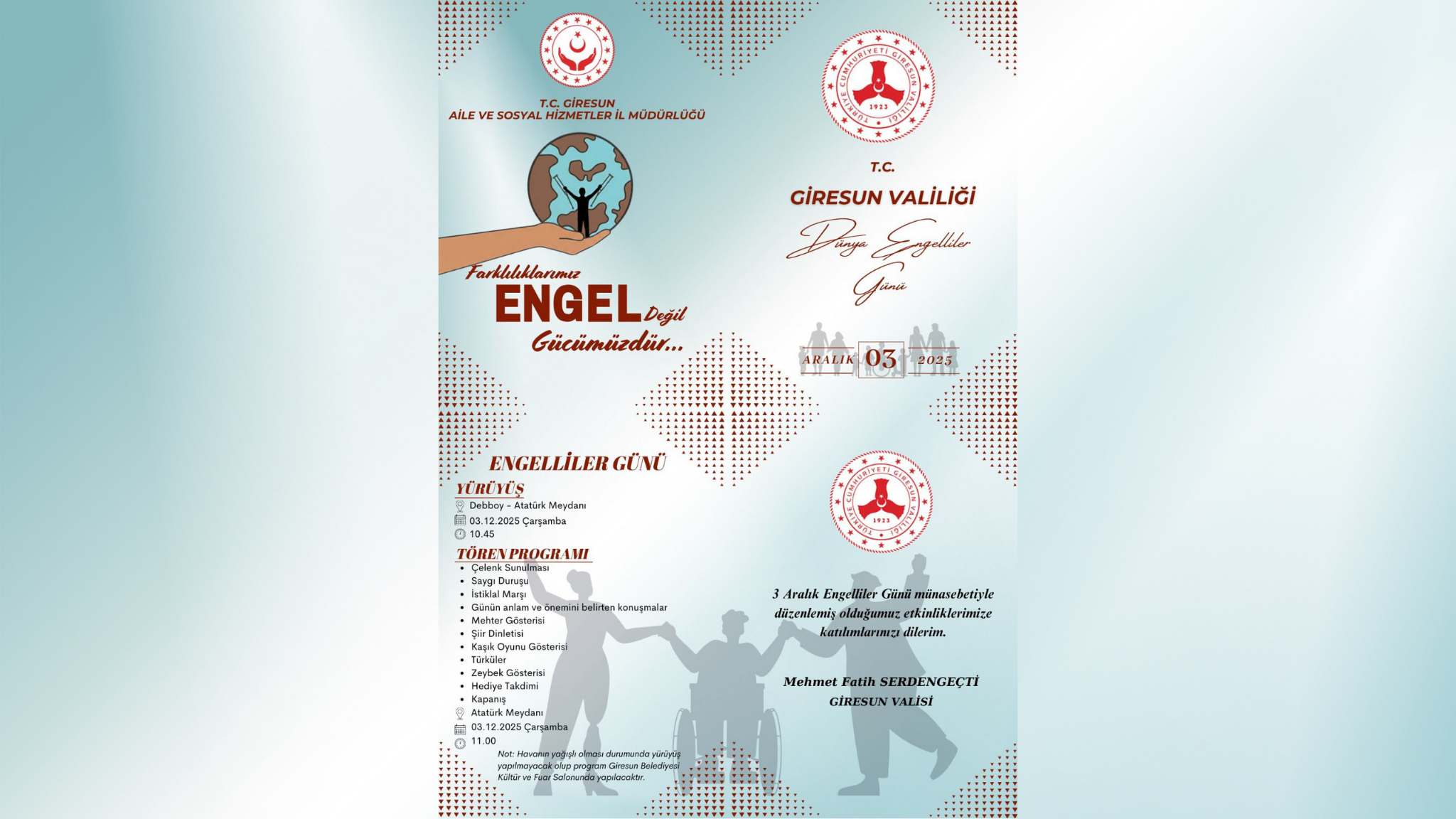 3 Aralık Engelliler Günü münasebetiyle düzenlemiş olduğumuz etkinliklerimize katılımlarınızı dileriz.