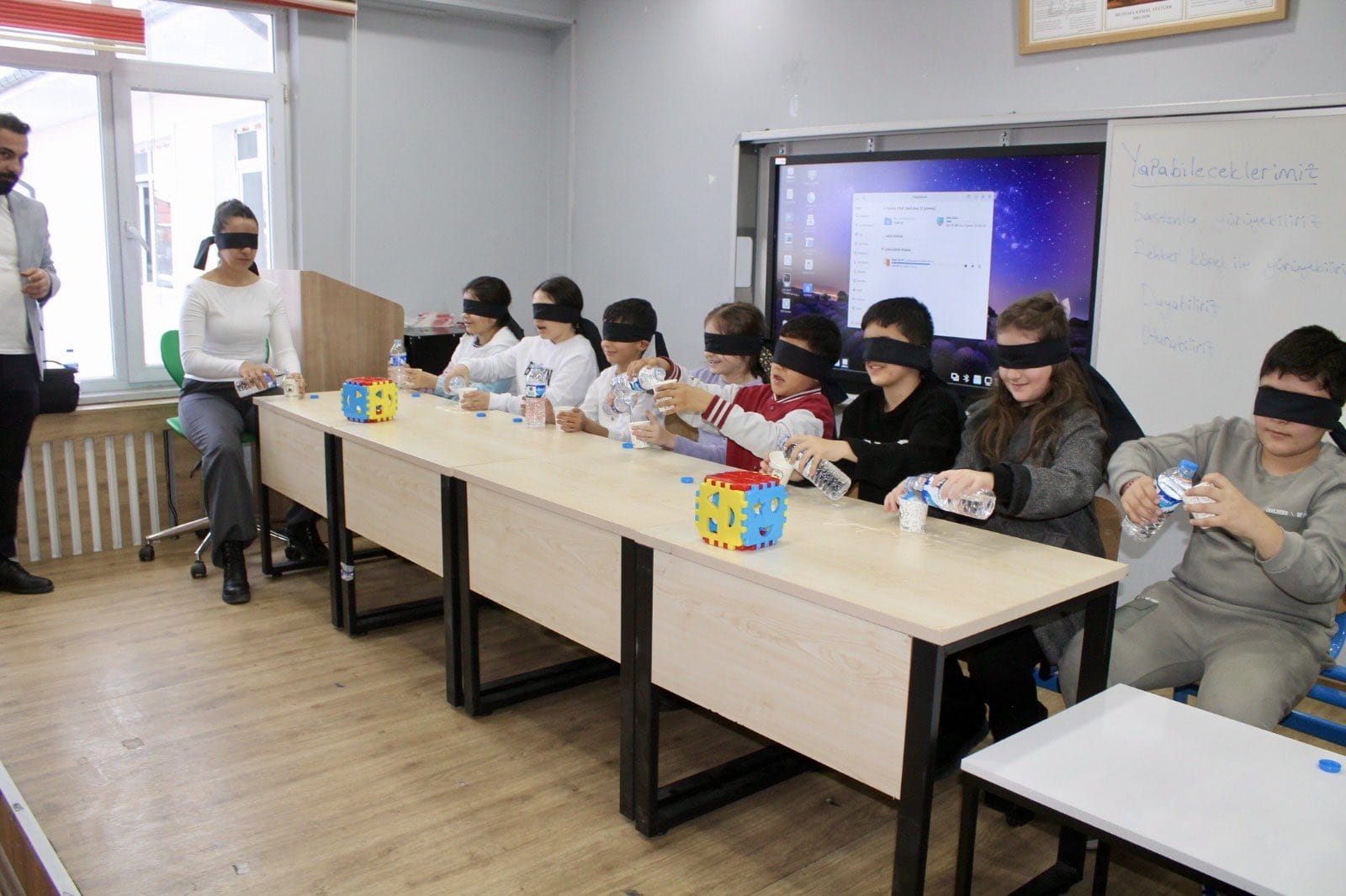Programın devamında öğrenciler, görme engelli bireylerin yaşadığı deneyimleri birebir hissedebilmek amacıyla gözleri kapalı şekilde çeşitli uygulamalara katıldı. Bu kapsamda öğrenciler; pet şişe açma, bardağa su doldurma, farklı nesneleri yerlerine yerleştirme ve yön bulma parkuru gibi etkinlikleri deneyimledi. Yapılan uygulamalar sayesinde öğrenciler, görme engelli bireylerin günlük hayatta karşılaştıkları güçlükleri daha yakından anlama fırsatı buldu.