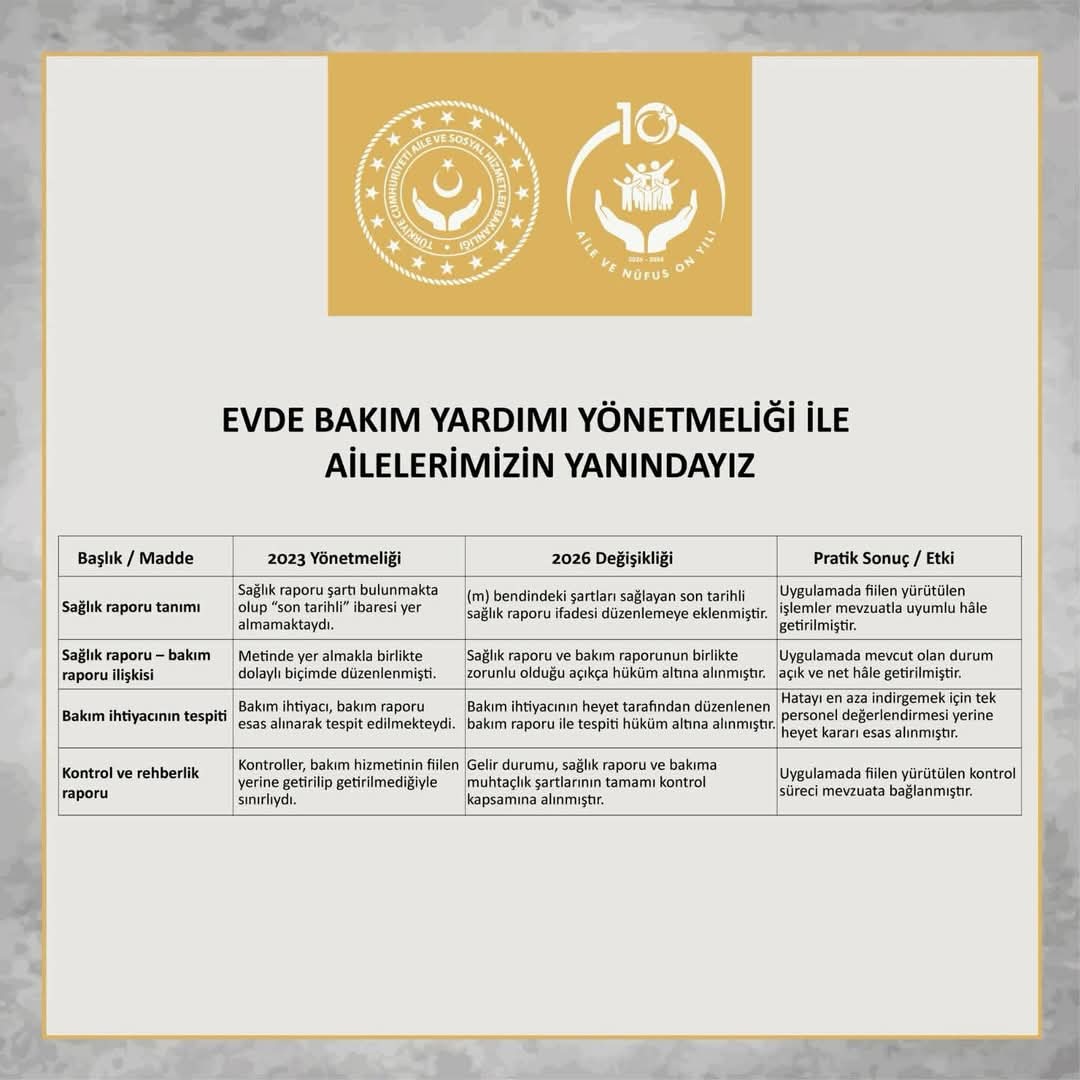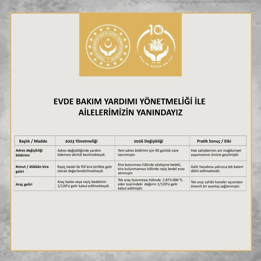 Evde Bakım Yardımı Yönetmeliğinde yaptığımız güncellemelerle, uygulamaya ilişkin bazı şartları sadeleştirerek, gelir hesaplamasına yönelik engelli vatandaşlarımız lehine düzenlemeler yaptık.