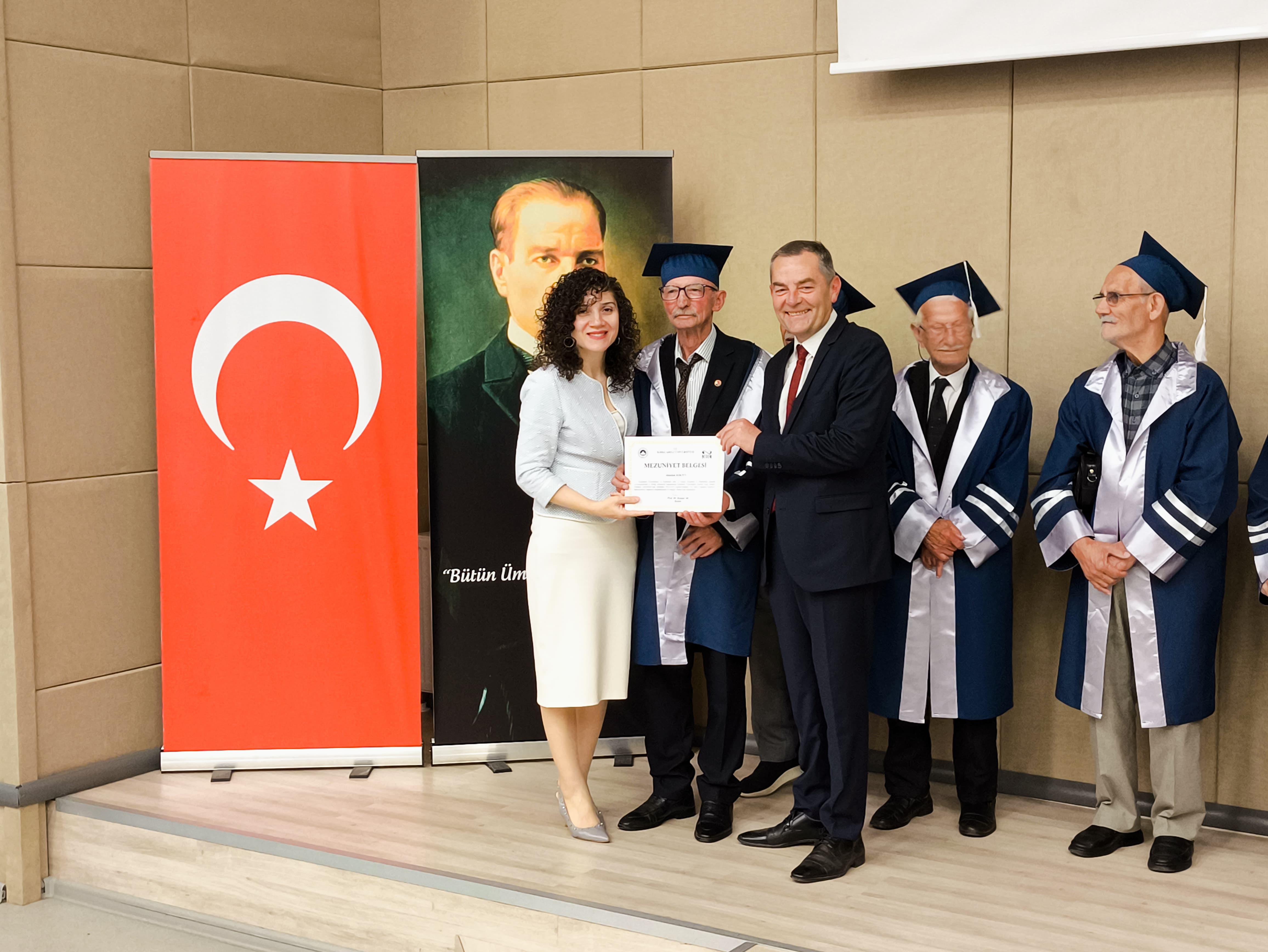 19 Şubat 2025 tarihinde başlayan eğitim süreci, eğitmenlerin desteği, değerli büyüklerimiz ve gönüllü genç üniversite öğrencilerimizin gayretiyle başarıyla tamamlandı. Eğitimin sonunda, 21 Mayıs 2025 tarihinde Kırklareli Üniversitesi Konferans Salonu’nda düzenlenen törenle değerli büyüklerimizin mezuniyet belgeleri; Kırklareli Vali Yardımcısı Elif Canan TUNCER, Kırklareli Üniversitesi Rektörü Prof. Dr. Rengin AK ve Aile ve Sosyal Hizmetler İl Müdürü Bilgin ÖZBAŞ tarafından takdim edildi.