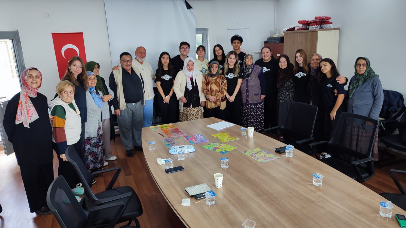 Yaşlılarımızla keyifli sohbetler eşliğinde çeşitli etkinlikler gerçekleştiren öğrenciler, ebru atölyesinde hazırladıkları eserlerle günümüze renk kattılar.
