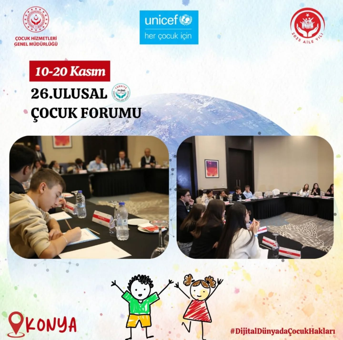 "Dijital Dünyada Çocuk Hakları" temasıyla düzenlenen Ulusal Çocuk Forumumuz, 7 bölgede on gün boyunca devam ediyor. 81 ilden gelen Çocuk Hakları Komitesi üyesi çocuklarımız, dijital dünyada kendi haklarını öğreniyor, fikirlerini paylaşıyor ve çözüm önerileri geliştiriyor.