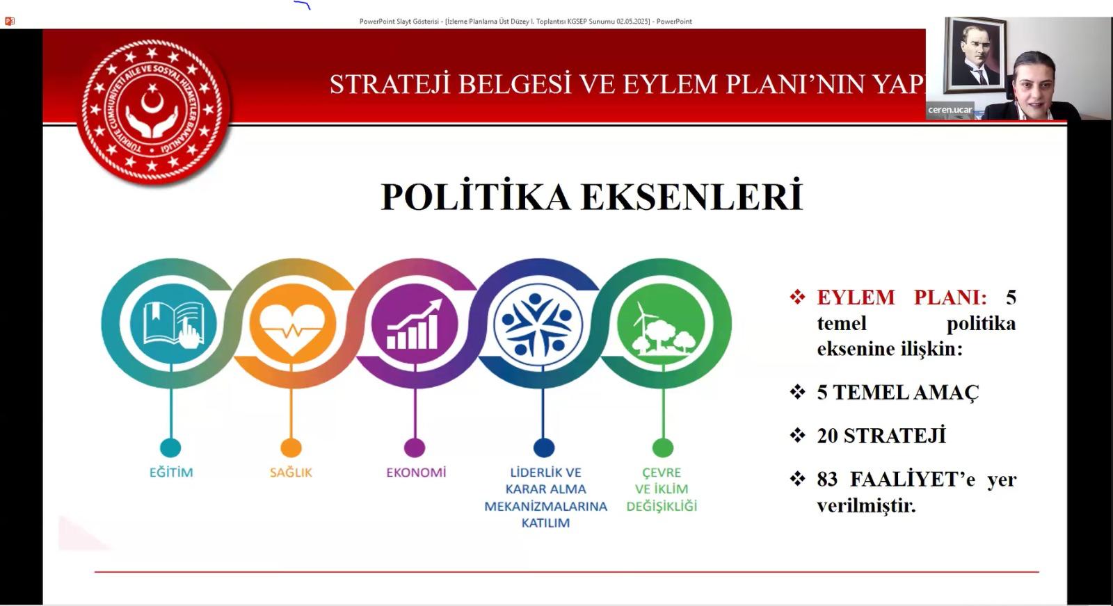 Toplantıda konuşmalarını gerçekleştiren Kadının Statüsü Genel Müdürü Sayın Süreyya ERKAN, Strateji Belgesi ve Eylem Planının kurumlarla işbirliği içerisinde etkin bir şekilde izlemesinin önemine vurgu yaparak; eylem planı faaliyetlerinin taşra teşkilatı, bağlı kuruluşlar ve üniversitelere yaygınlaştırılmasının gerekli olduğunu belirtti.