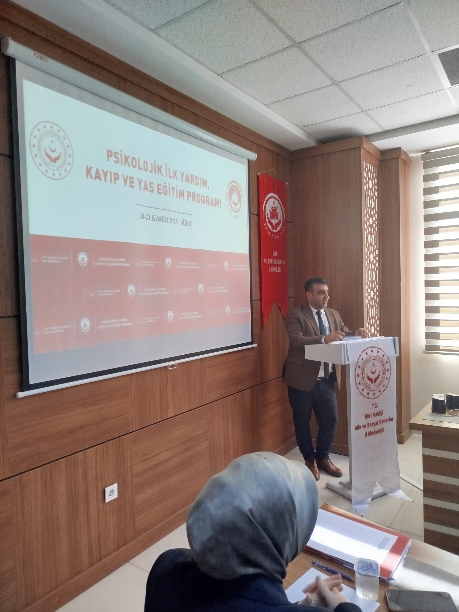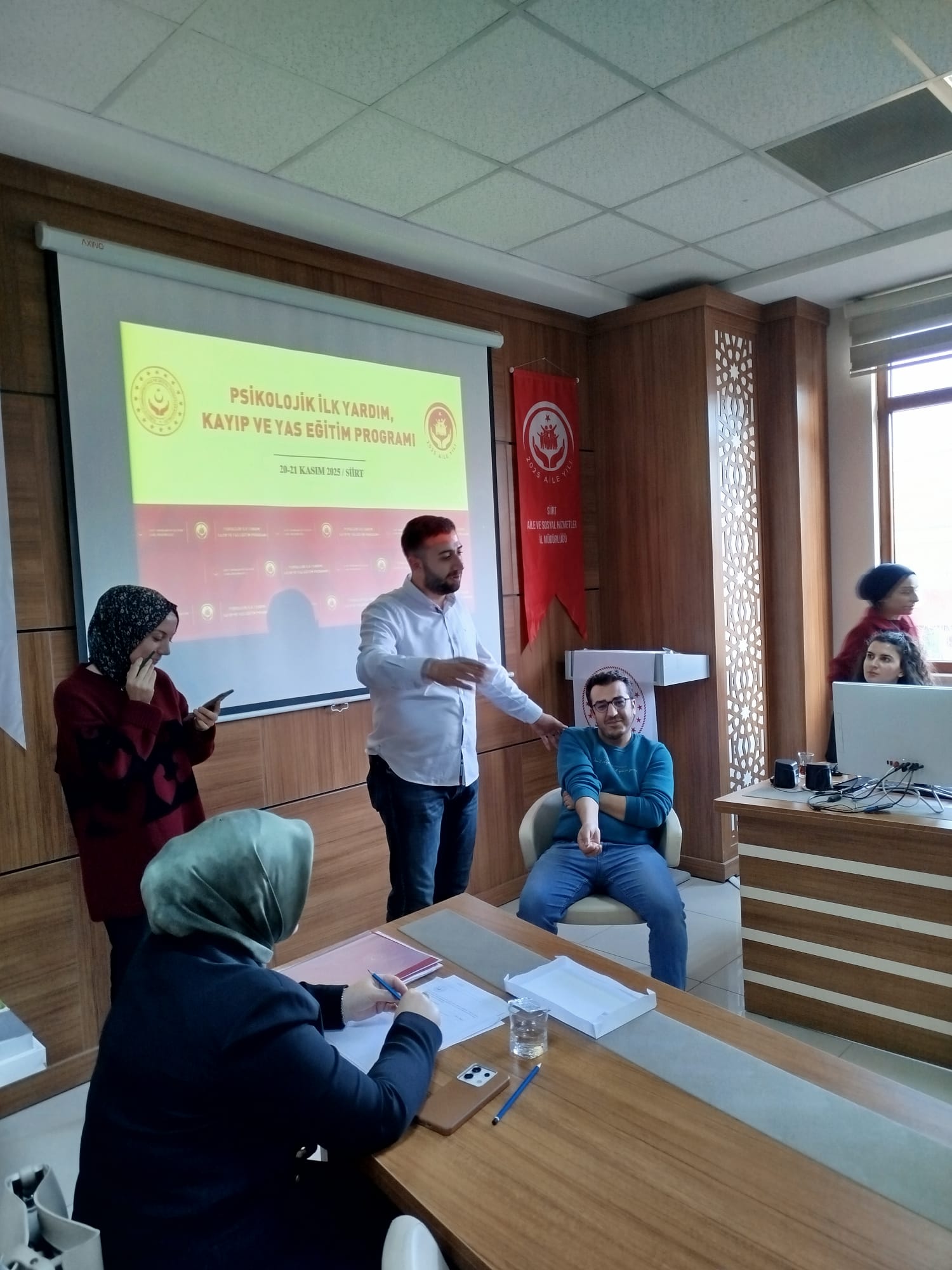 Bakanlığımız Şehit Yakınları ve Gaziler Genel Müdürlüğü tarafından hazırlanan “Psikolojik İlk Yardım, Kayıp ve Yas” konulu eğitim programı; İl Müdürlüğümüz ve bağlı kuruluşlarımızda görev yapan personellerin katılımıyla, Bakanlığımız eğiticileri Sn. Canan Sitti ve Sn. Fatma Koçbulut Maviş tarafından 20-21 Kasım tarihlerinde, 10.00–17.00 saatleri arasında İl Müdürlüğümüz toplantı salonunda gerçekleştirilmiştir.