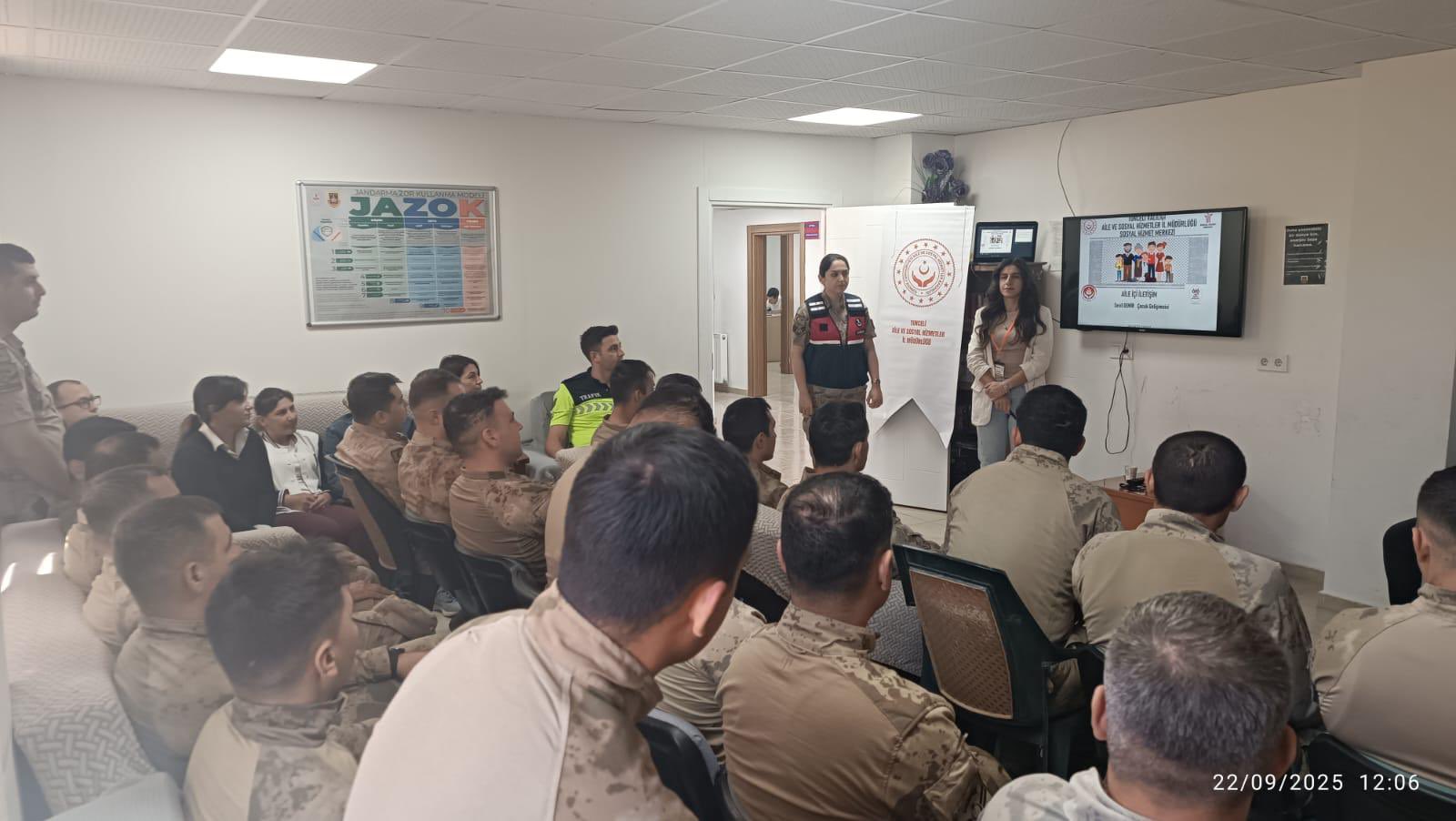Müdürlüğümüze bağlı Tunceli Sosyal Hizmet Merkezi Müdürlüğü Aile Danışmanlığı Birimi tarafından, Nazımiye İlçe Jandarma Komutanlığı’nda “Aile İçi İletişim ve Evlilik Öncesi Eğitim” düzenlendi. Etkili iletişimin aile ilişkilerini güçlendirdiği, sağlıklı aile yapısının bireylerin iyi oluşuna katkı sunduğu vurgulandı.