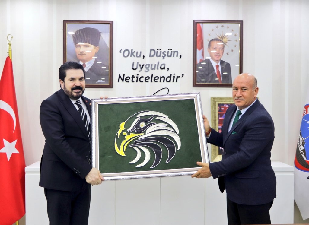 Ağrı Aile, Çalışma ve Sosyal Hizmetler İl Müdürümüz Mehmetşafi ERİM, Ağrı Belediye Başkanı Savcı SAYAN’ı makamında ziyaret ederek İl Müdürlüğümüzün çalışmaları hakkında görüş alışverişinde bulundu. İl Müdürümüz ziyaretinde Belediye Başkanı Savcı SAYAN’a, “Kartal Başlı” Filografi tablosu çalışması ile İl Müdürlüğümüz 2015-2019 faaliyet raporu kitapçığını hediye etti. Ağrı Belediye Başkanı Savcı SAYAN ise İl Müdürümüz Mehmetşafi ERİM’e, Ay Yıldızlı bayrağımızın filografi sanatıyla yapılmış tablosunu hediye etti.