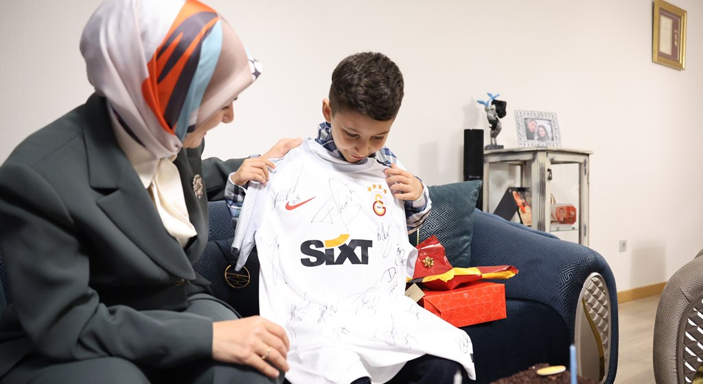 Bakan Göktaş, fanatik Galatasaray taraftarı olan Ata Alp’e Galatasaraylı futbolcular tarafından imzalanan forma hediye etti.