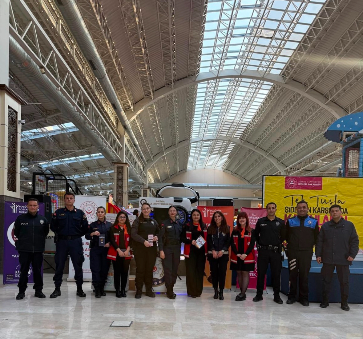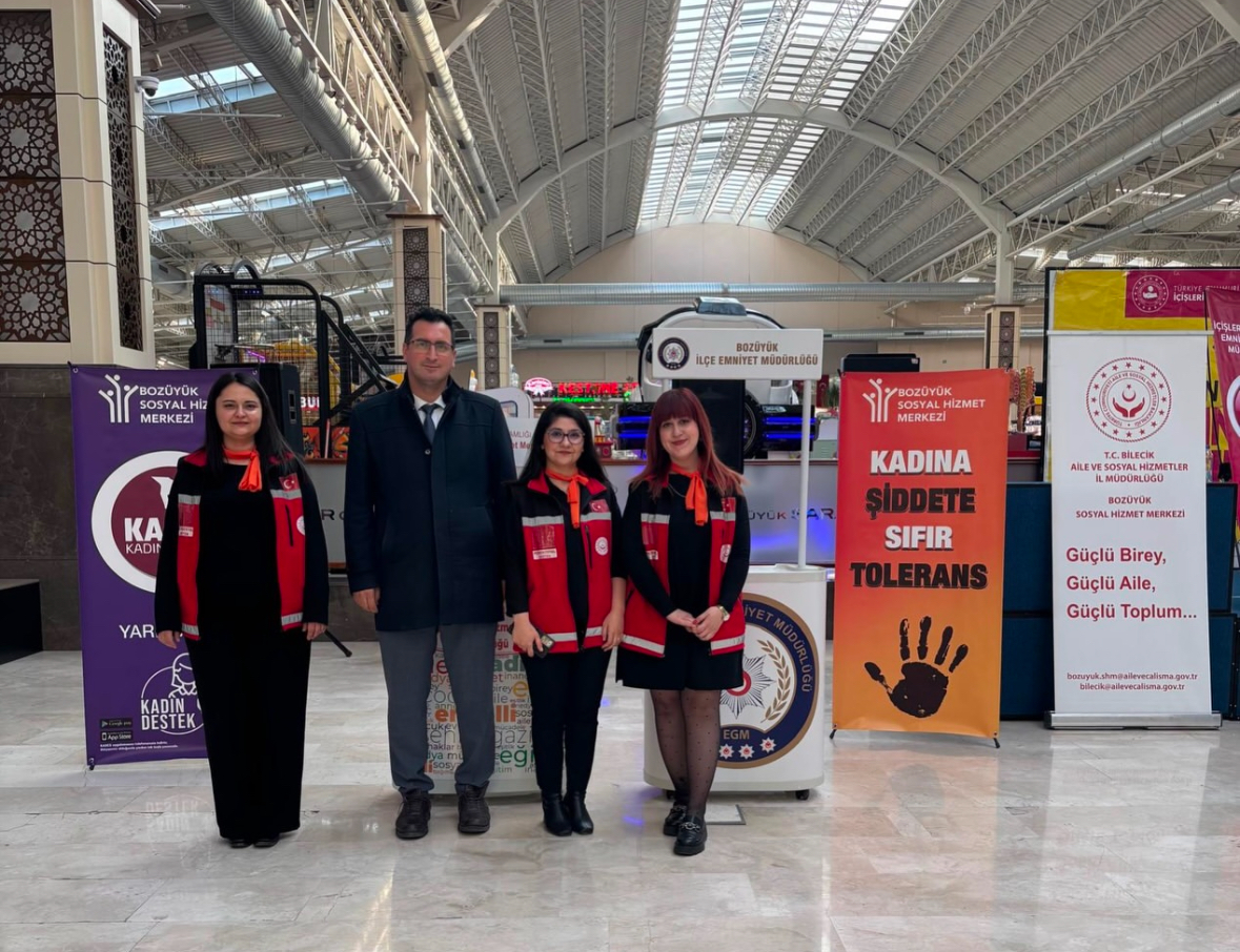 25 Kasım Kadına Yönelik Şiddete Karşı Uluslararası Mücadele Günü kapsamında Bozüyük Sarar AVM'de Müdürlüğümüz tarafından Bozüyük Kaymakamı Sayın Adem ÖZTÜRK'ün de katılımlarıyla vatandaşlarımıza Bakanlığımız Alo 183 İhbar Hattı, KADES uygulaması, 112 Acil Durum Hattı konularında bilgilendirme çalışmaları yapılmıştır.