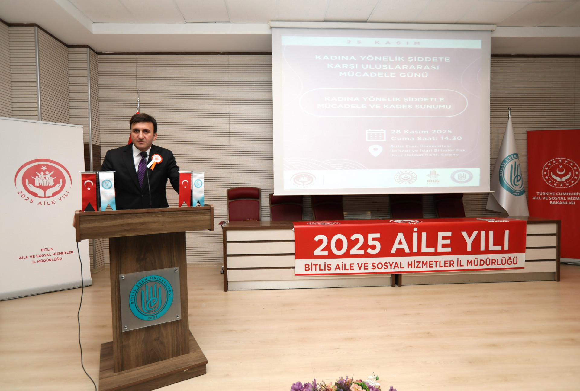 Bitlis Eren Üniversitesi İbn Haldun Konferans Salonunda, Bitlis Valiliği, Bitlis Eren Üniversitesi Kadın ve Genç Girişimcileri Destekleme Eğitim Uygulama ve Araştırma Merkezi ile Bitlis Aile ve Sosyal Hizmetler İl Müdürlüğümüz iş birliğinde “25 Kasım Kadına Yönelik Şiddete Karşı Uluslararası Mücadele Günü” kapsamında “Kadına Yönelik Şiddetle Mücadele ve KADES Sunumu” temalı bir program gerçekleştirildi. Kurum temsilcilerinin katılımıyla düzenlenen etkinlik, toplumda farkındalık oluşturmayı amaçlayan kapsamlı bir eğitim çalışması olarak planlandı.