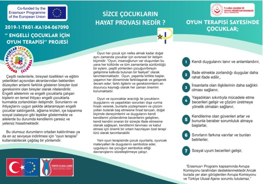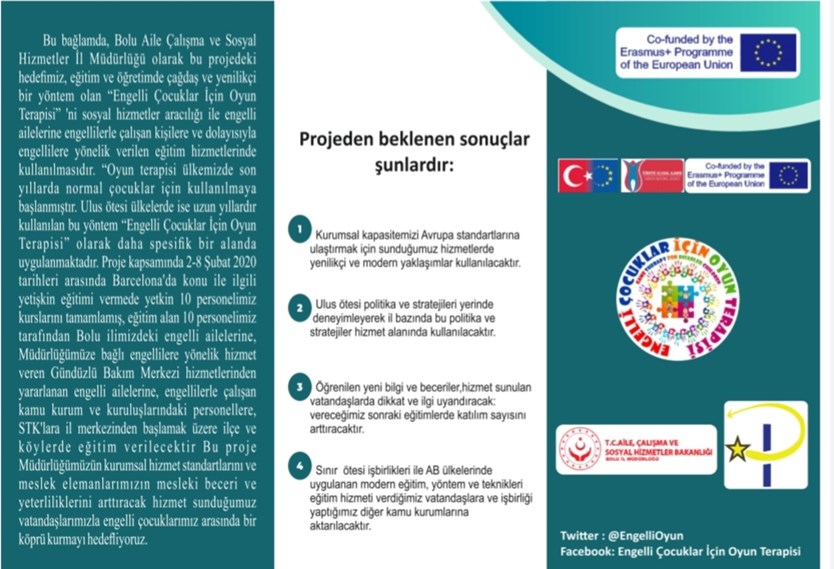 Bolu Aile Çalışma ve Sosyal Hizmetler İl Müdürlüğü olarak bu projedeki hedefimiz eğitim ve öğretimde çağdaş ve yenilikçi bir yöntem olan "Engelli Çocuklar İçin Oyun Terapisi" Sosyal Hizmetler aracılığıyla Engelli ailelerine, engellilerle çalışan kişilere ve dolayısıyla engellilere yönelik verilen eğitim hizmetlerinde kullanılmasıdır. " Erasmus + Programı kapsamında Avrupa Komisyonu tarafından desteklenmektedir ancak burada yer alan görüşlerden Avrupa Komisyonu ve Türkiye Ulusal Ajansı sorumlu tutulamaz"