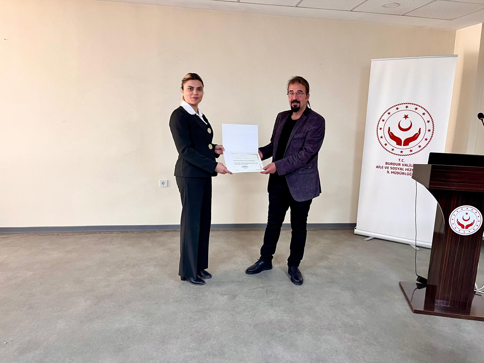 Program sonunda, katkılarından dolayı Prof. Dr. Ahmet Hulusi Dinçoğlu’na, İl Müdür Yardımcımız Eylem Çavdar tarafından teşekkür belgesi takdim edildi.