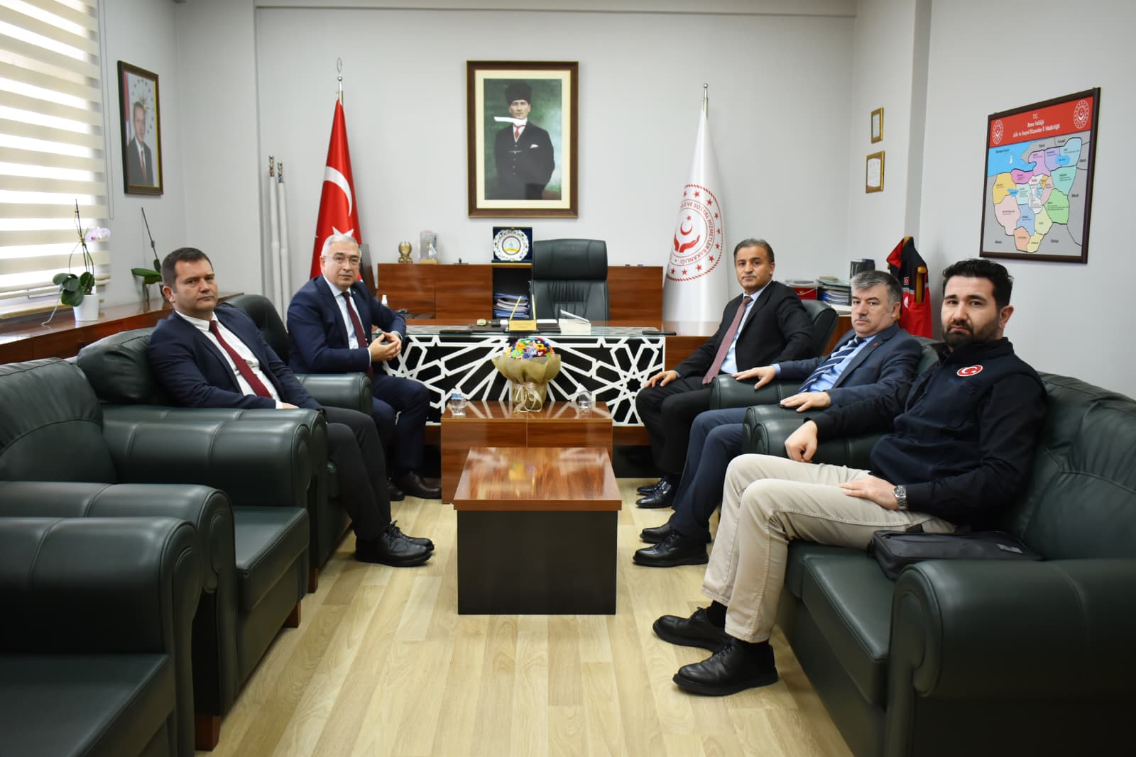 Balıkesir ve Bursa illerini kapsayan izleme ziyaretleri çerçevesinde, ilimizde bulunan Aile ve Toplum Hizmetleri Genel Müdürlüğü Daire Başkanı Nevzat Özer, Milli Eğitim Bakanlığı Temel Eğitim Genel Müdürlüğü Daire Başkanı Fatih Başak, Halk Sağlığı Genel Müdürlüğü Uzman Dr. Özgür Erdem ile Çevre, Şehircilik ve İklim Değişikliği Bakanlığı Kentsel Dönüşüm Başkanlığı Şube Müdürü Onat Çağatay Muş’u İl Müdürümüz Faruk Uysal İle bir araya geldiler.