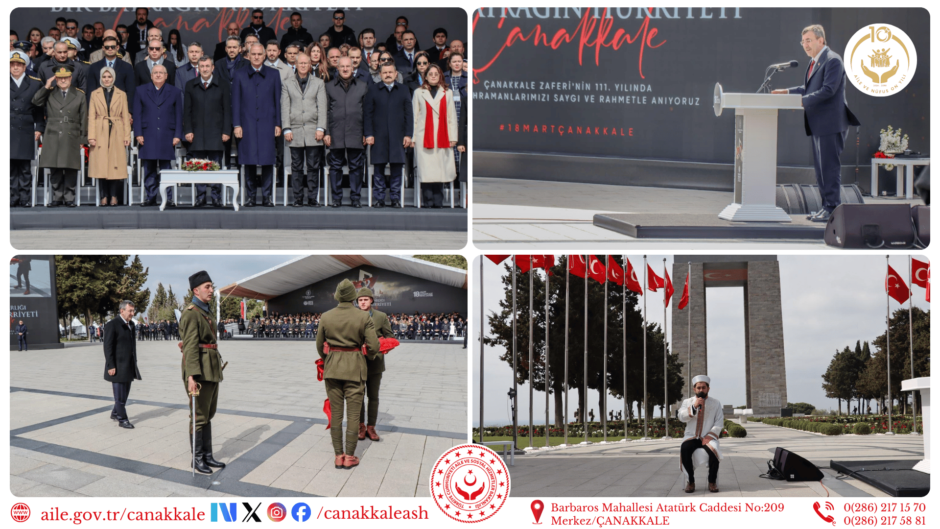 Çanakkale Zaferi’nin 111. yıl dönümünde, Şehitler Abidesi’nde düzenlenen törende, vatan uğruna canlarını feda eden aziz şehitlerimiz rahmet, minnet ve saygıyla anıldı. Törene; Cumhurbaşkanı Yardımcısı Sayın Cevdet YILMAZ, Aile ve Sosyal Hizmetler Bakanımız Sayın Mahinur ÖZDEMİR GÖKTAŞ, Milli Savunma Bakanı Sayın Yaşar GÜLER, Kültür ve Turizm Bakanı Sayın Mehmet Nuri ERSOY, KKTC Çalışma ve Sosyal Güvenlik Bakanı Oğuzhan HASİBOĞLU, Valimiz Sayın Doç. Dr. Ömer TORAMAN, Çanakkale Savaşları Tarihi Alan Başkanı İsmail KAŞDEMİR, İl Müdürümüz Ali ÖMÜT protokol üyeleri ve davetliler katıldı.