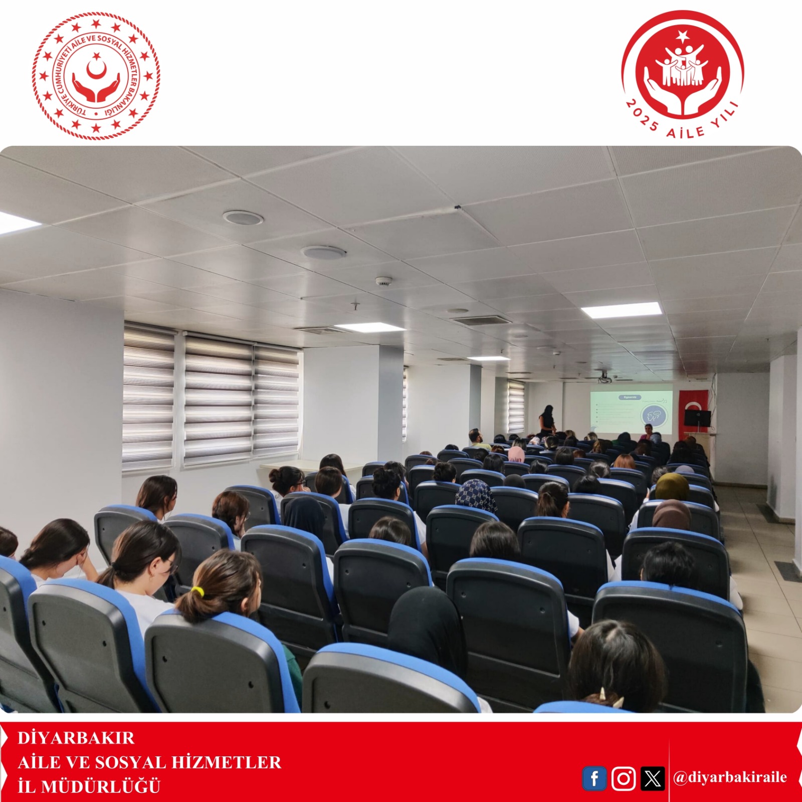 2025 Aile Yılı etkinlikleri kapsamında, Diyarbakır Kayapınar Sosyal Hizmet Merkezi Müdürlüğü Eğitim Birimi tarafından, S.B.Ü. Diyarbakır Gazi Yaşargil Eğitim ve Araştırma Hastanesi (Ek Bina) konferans salonunda sağlık çalışanlarına yönelik “Aile ve Çocukla Etkili İletişim ve Kadına Yönelik Şiddetle Mücadele (KYŞM)” konulu eğitim programı gerçekleştirilmiştir.
