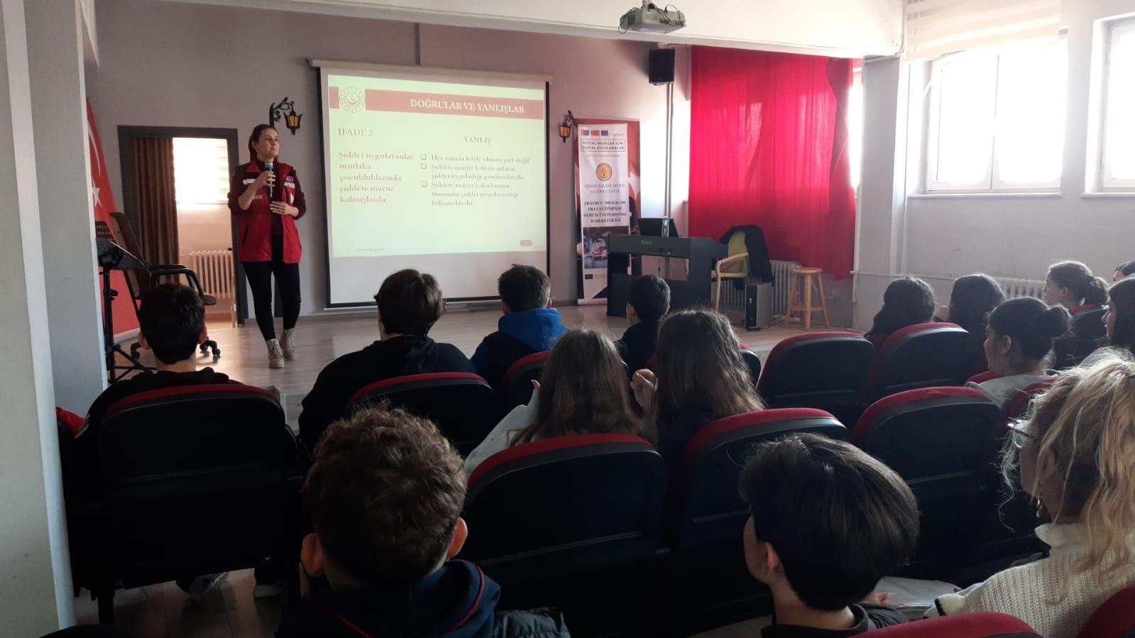 Edirne Aile ve Sosyal Hizmetler İl Müdürlüğüne bağlı Şiddet Önleme ve İzleme Merkezi Müdürlüğünce İlhami Ertem Anadolu Lisesi öğrencilerine Kadına Yönelik Şiddetle Mücadele eğitimi verildi.