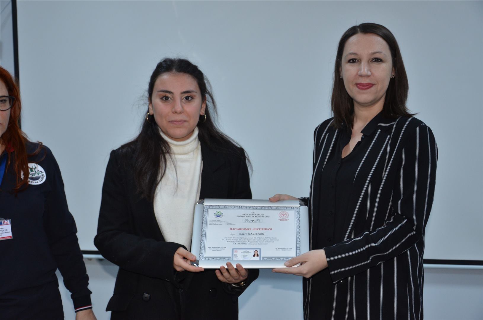 Düzenlenen sertifika takdimine; Edirne Vali Yardımcısı Ali UYSAL, Edirne Aile Çalışma ve Sosyal Hizmetler İl Müdürü Bilgin ÖZBAŞ, İl Sağlık Müdürü Ali Cengiz KALKAN, 112 Acil Çağrı Merkezi Müdürü İsmail ÖZTUNA, Edirne Huzurevi Müdürü Tamer TAHMAZOĞLU, Çocuk Evleri Koordinasyon Merkezi Müdürü Derya DİLLEK BUDAK, Halk Sağlığı Hizmetleri Başkanı Selma HEVES YILMAZ, Proje ve Eğitim Koordinatörleri ve Uygulamalı İlk Yardım Eğitimini başarı ile tamamlayan kursiyerler katılım sağladı.
