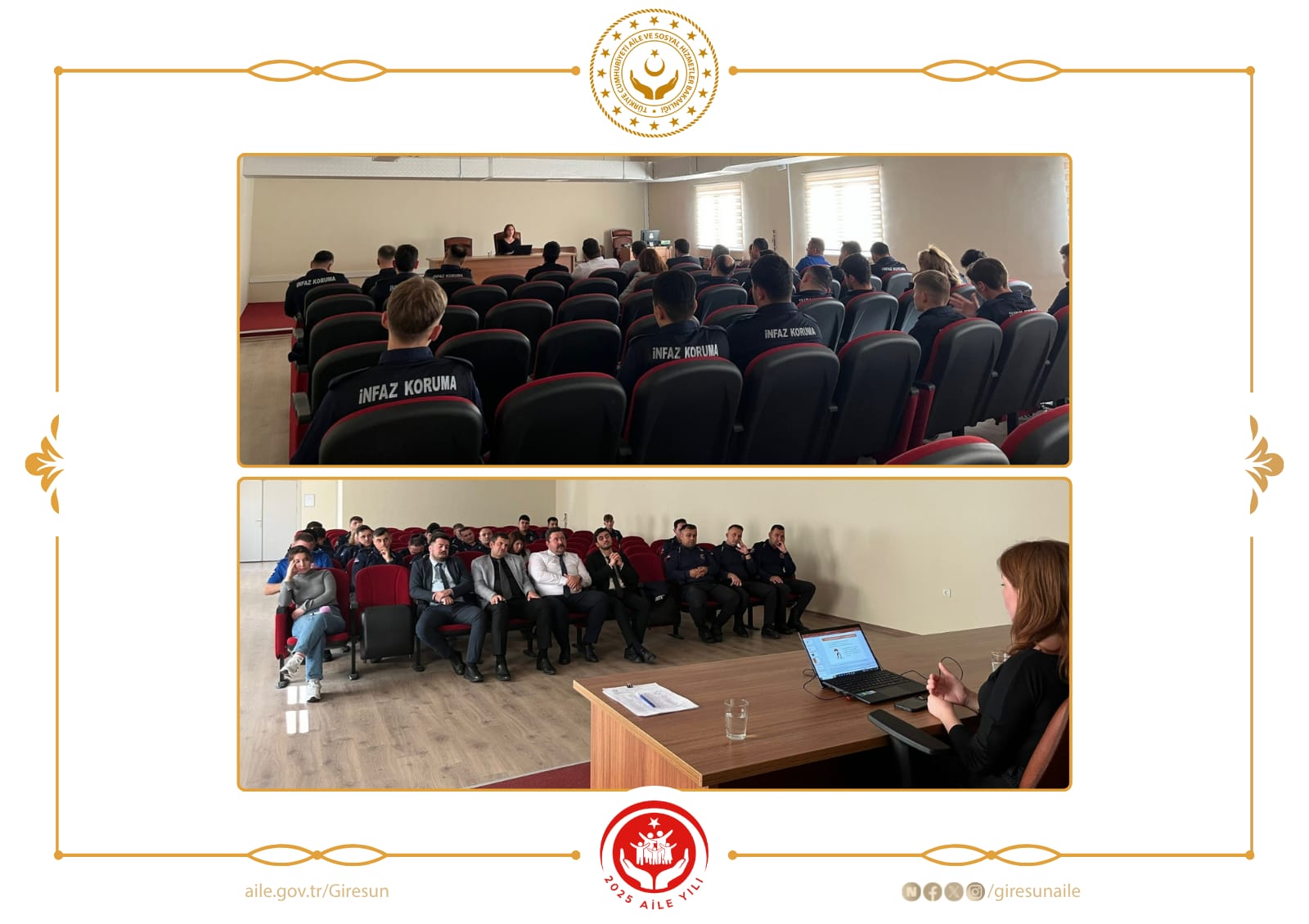 Giresun Aile ve Sosyal Hizmetler İl Müdürlüğümüze bağlı Espiye Sosyal Hizmet Merkezi Müdürlüğümüzce, Espiye L Tipi Kapalı ve Açık Ceza İnfaz Kurumu'nda görevli personellere yönelik "Evlilikte İletişim ve Yaşam Becerileri" konulu eğitim düzenlenmiştir. Kurumlar arası işbirliğiyle gerçekleşen bu eğitim ile personelin kişisel ve aile içi gelişimine katkı sağlanmıştır.