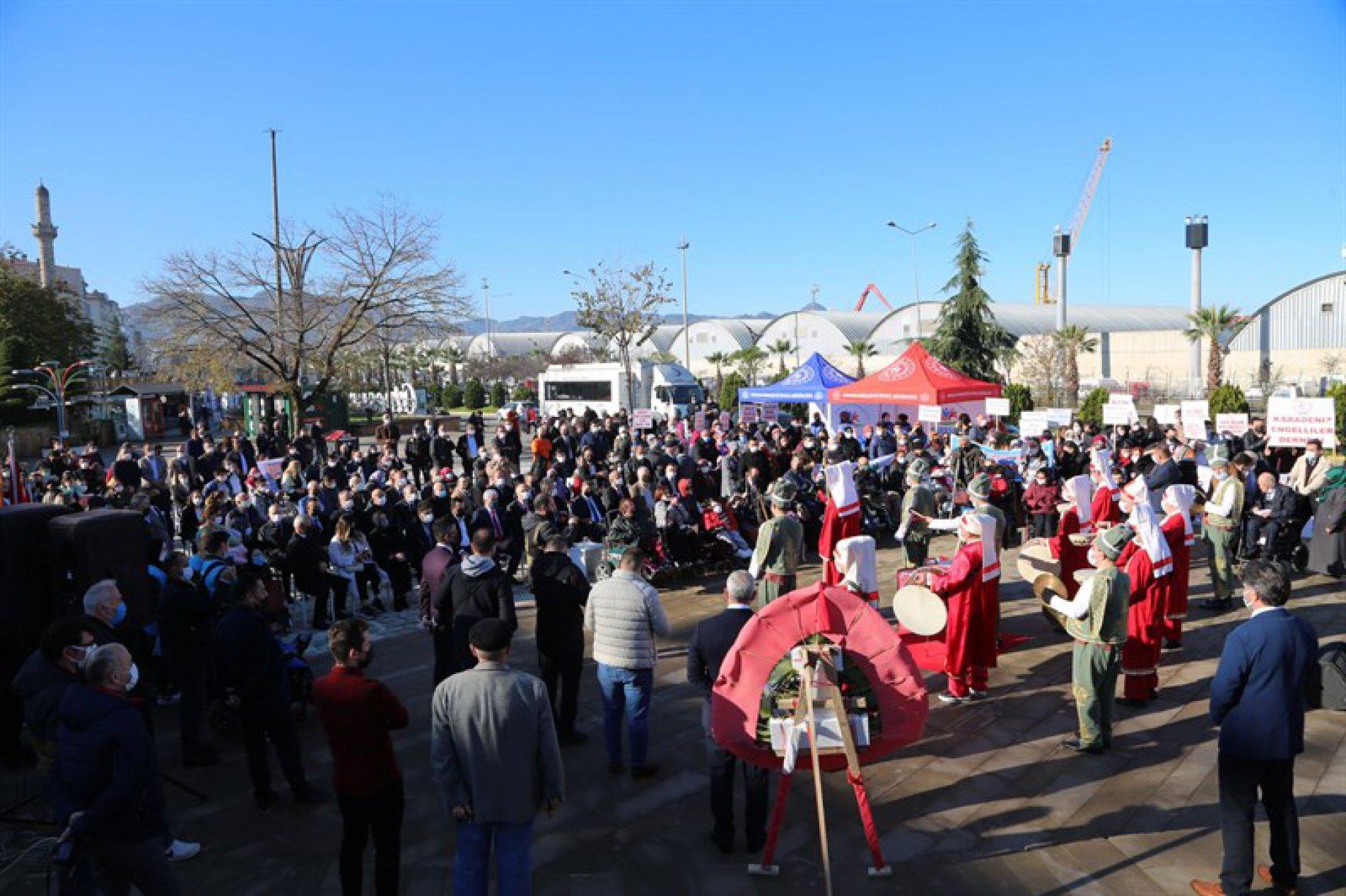Giresun Atatürk Meydanı'nda Giresun Aile ve Sosyal Hizmetler İl Müdürlüğü'nün koordinasyonunda 3 Aralık Dünya Engelliler Günü etkinlikleri kapsamında düzenlenen program, Engelli dernekleri adına yönetmeliğe uygun olarak hazırlanan tek bir çelengin 3 Aralık Cuma günü saat 10.30'da Atatürk Anıtına sunum töreni ile başladı.