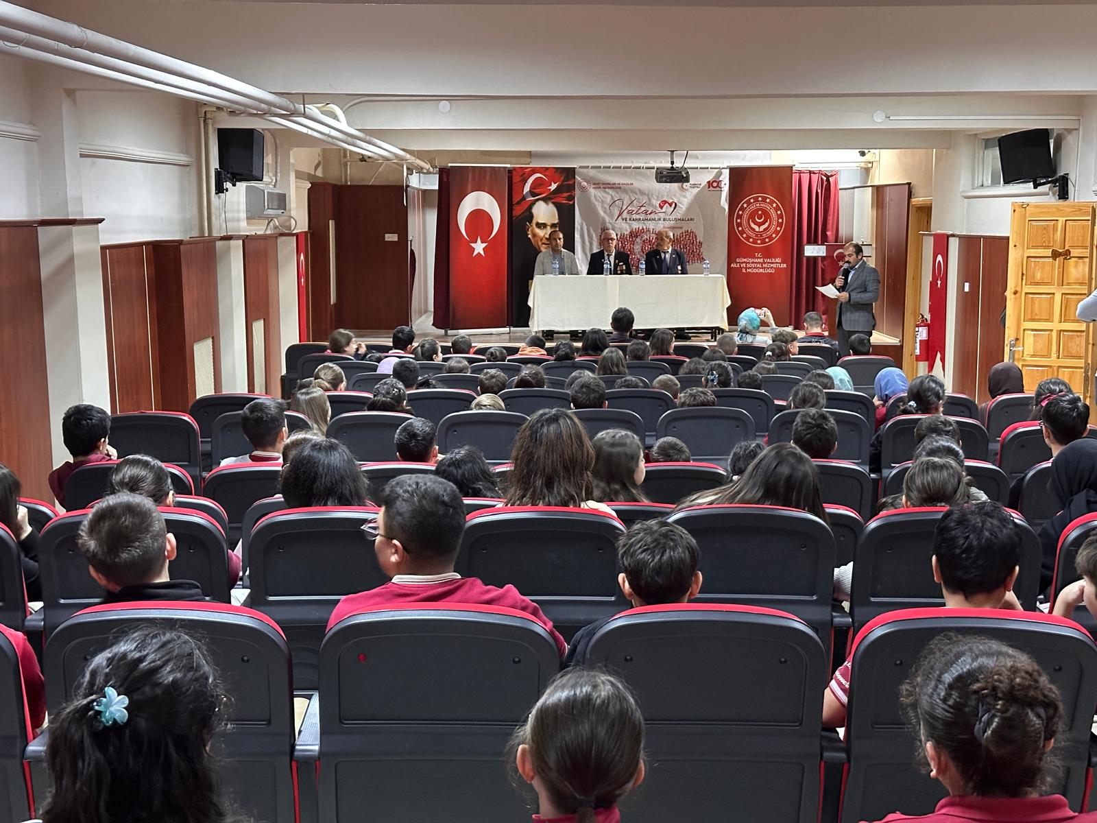 Aile ve Sosyal Hizmetler İl Müdürlüğü olarak, Gümüşhane Dumlupınar Ortaokulu’nda “Vatan ve Kahramanlık Buluşmaları” programı gerçekleştirildi. Etkinlik kapsamında gazilerimiz, şehit yakınlarımız ve öğrencilerimiz bir araya gelerek anlamlı anlar yaşadı. Vatan sevgisinin, kahramanlık ruhunun ve milli birlik bilincinin pekiştirildiği programda, öğrencilerimizin gazilerimizle bir araya gelmesi büyük bir duygu yoğunluğu oluşturdu.