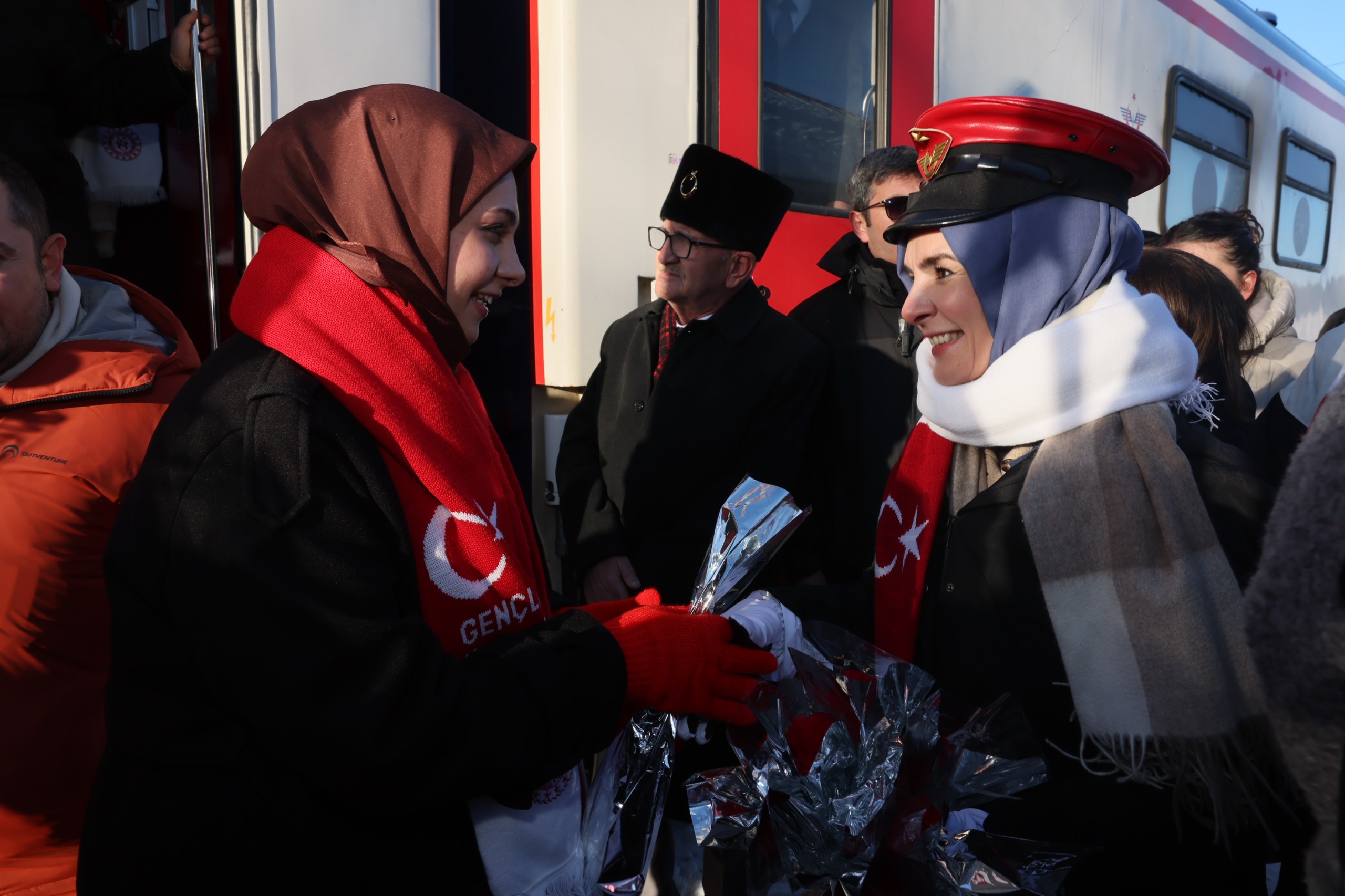 Bakan Göktaş ardından Sarıkamış Şehitleri'ni anma etkinlikleri için Ankara'dan Kars'a "Sarıkamış Ekspresi" ile gelen gençleri karşıladı.