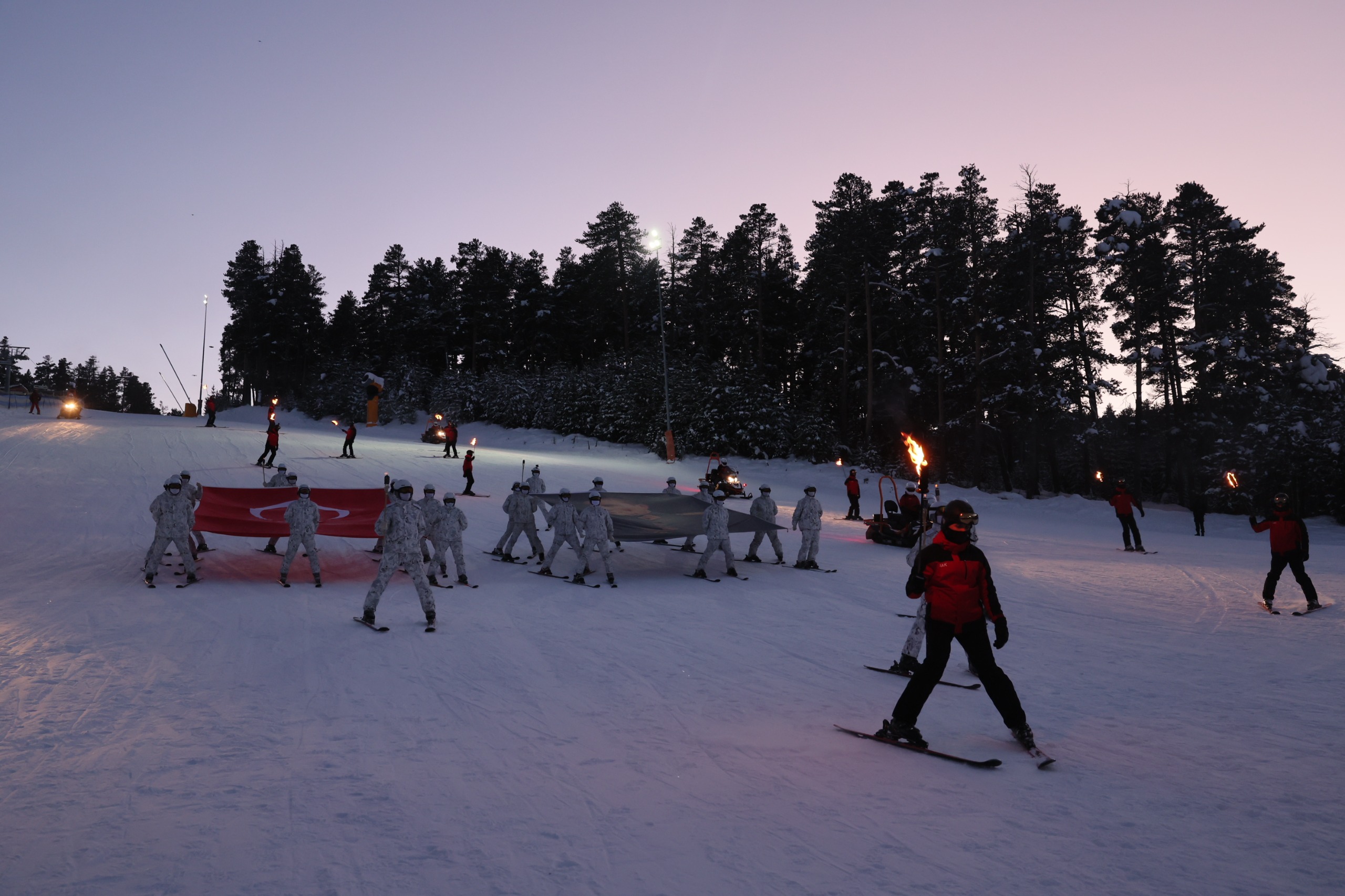 Sarıkamış Kayak Merkezi'nde düzenlenen etkinlikte, Çanakkale'deki 57. Alaya ithafen Sarıkamış'ta konuşlanan 57. Komando Taburu'nda görevli komandolar ve JAK timleri, ellerinde Türk bayrakları ve Atatürk posterleri taşıyarak meşalelerle zirveden indi.