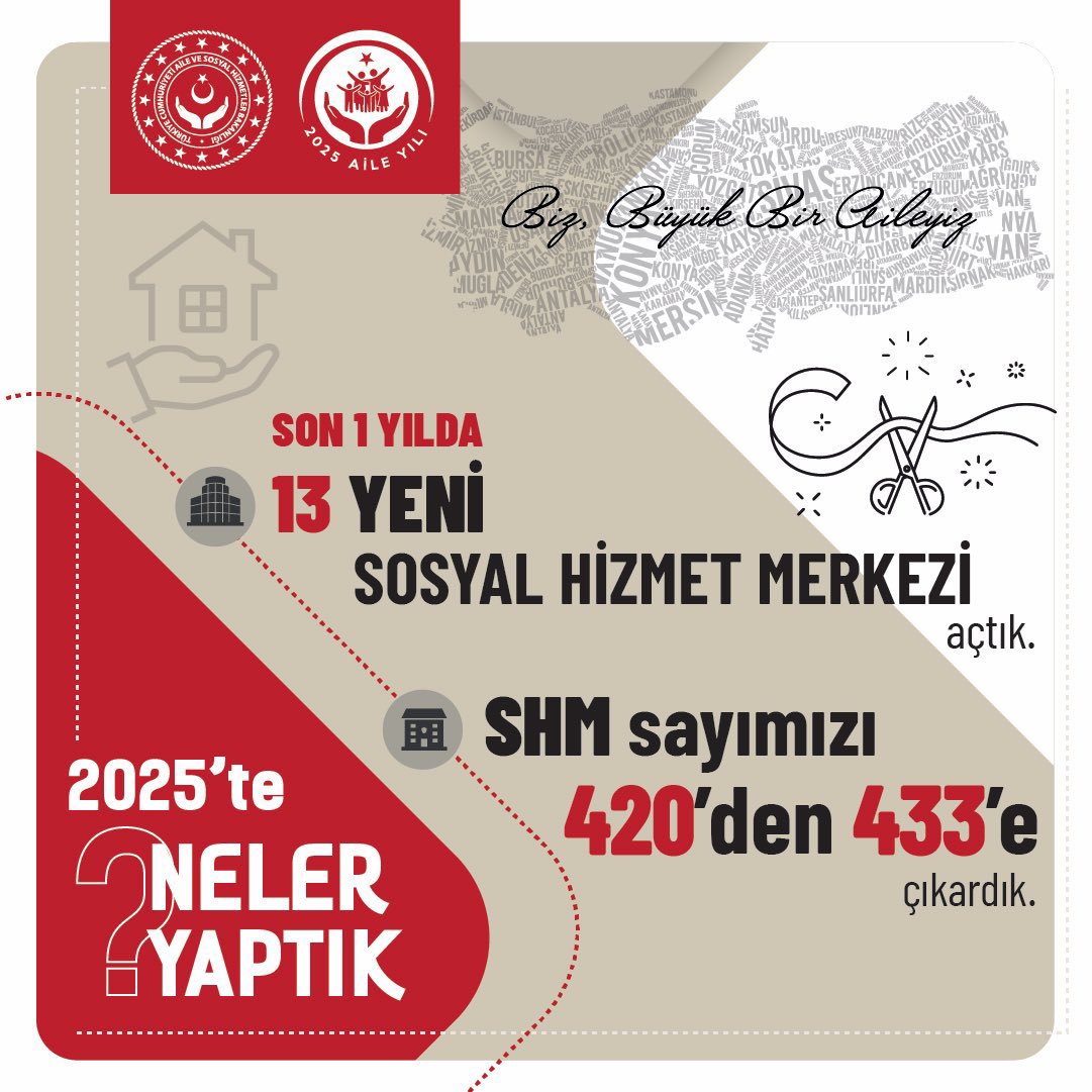 Aile Yılı'nda ülkemizin dört bir yanındaki Sosyal Hizmet Merkezi (SHM) ağımızı yeni merkezlerle güçlendirdik. 2025 yılında 13 yeni merkezi daha milletimizin hizmetine sunduk.