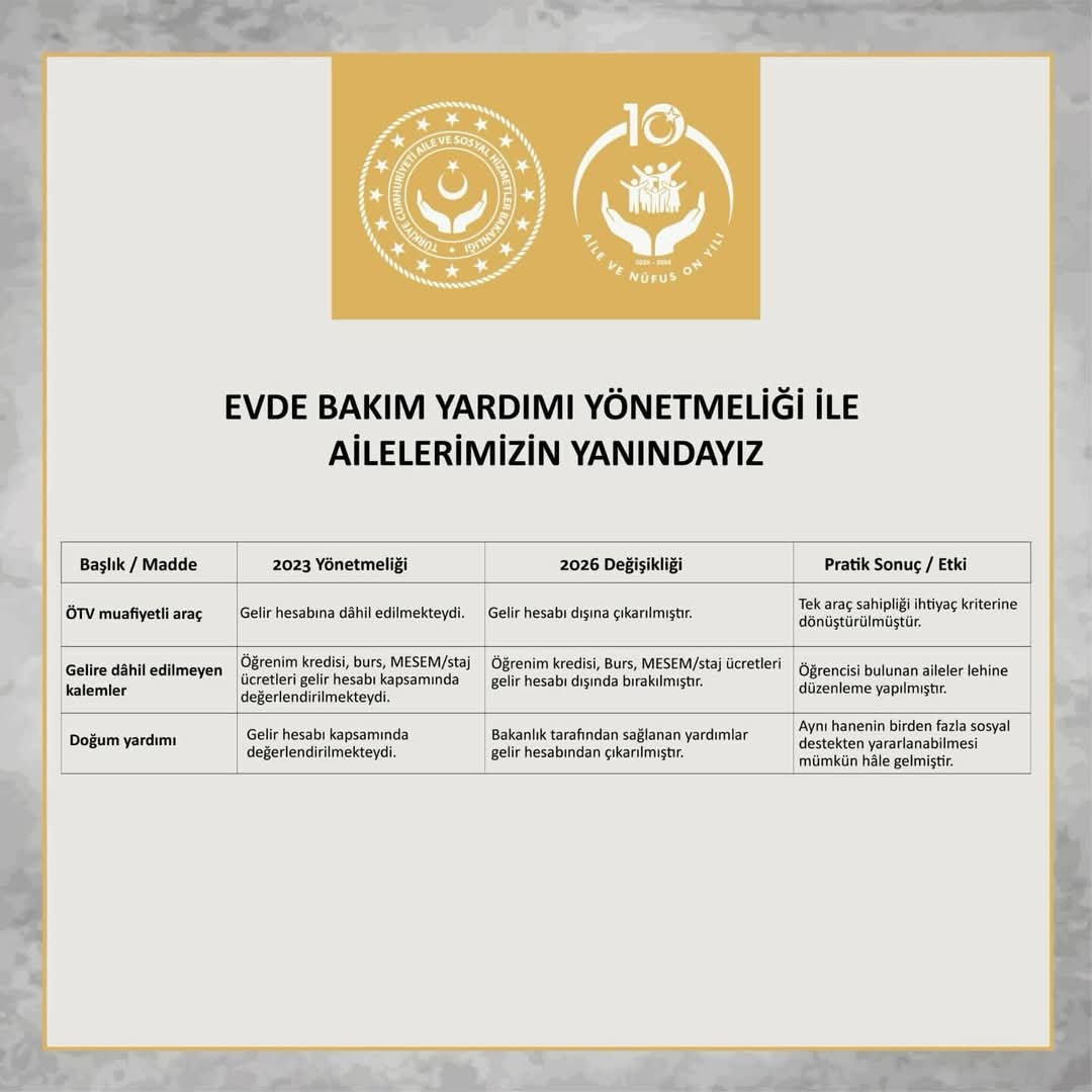 Evde Bakım Yardımı Yönetmeliğinde yaptığımız güncellemelerle, uygulamaya ilişkin bazı şartları sadeleştirerek, gelir hesaplamasına yönelik engelli vatandaşlarımız lehine düzenlemeler yaptık.