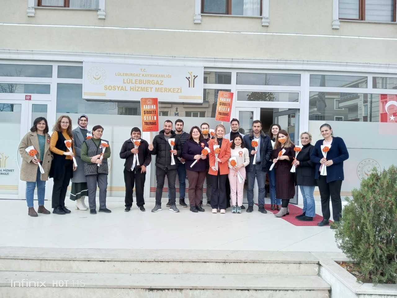 Lüleburgaz Sosyal Hizmet Merkezi Müdürlüğümüz personeli tarafından 25 Kasım Kadına Yönelik Şiddete Karşı Uluslararası Mücadele Günü Kapsamında Lüleburgaz Sokullu Mehmet Paşa İlçe Halk Kütüphanesi görevlilerine,39 Burda AVM'de çalışan personele, Lüleburgaz Sosyal Dayanışma Merkezi (SODAM) kadın kursiyer ve öğreticilere “KADES” broşürleri dağıtılmış, kadına yönelik şiddetle mücadele konusunda bilgilendirme yapılmıştır. Lüleburgaz Sosyal Hizmet Merkezi Müdürlüğümüzde görev yapan kadın personelimizin 25 Kasım Kadına Yönelik Şiddetle Mücadele Günü kutlanmış, günün rengi olan turuncu çiçekler dağıtılmıştır.
