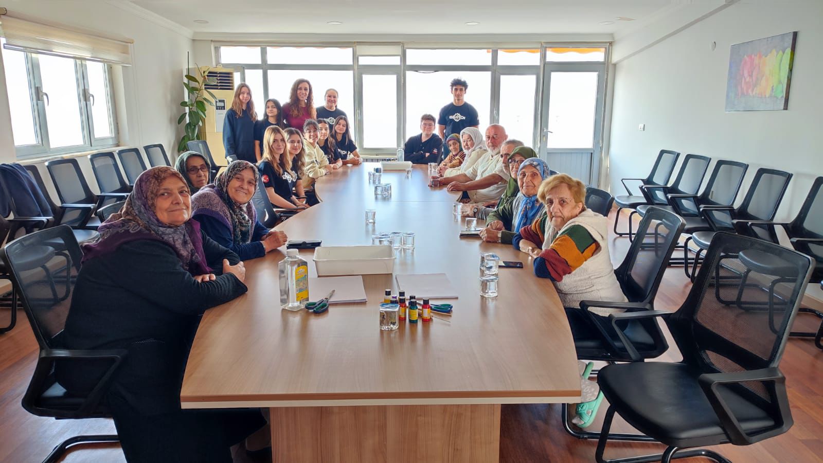 Yaşlılarımızla keyifli sohbetler eşliğinde çeşitli etkinlikler gerçekleştiren öğrenciler, ebru atölyesinde hazırladıkları eserlerle günümüze renk kattılar.