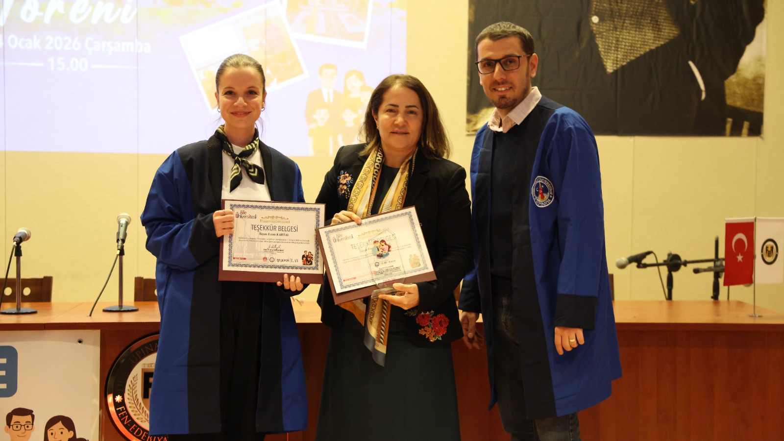 Programda yapılan konuşmaların ardından, Aile Üniversitesi programına katkı sunan akademisyenler ile programa katılan ailelere, protokol üyeleri tarafından belge ve plaket takdim edildi. Tören, Aile Üniversitesi programından mezun olan ailelerin kep atma töreniyle sona erdi.