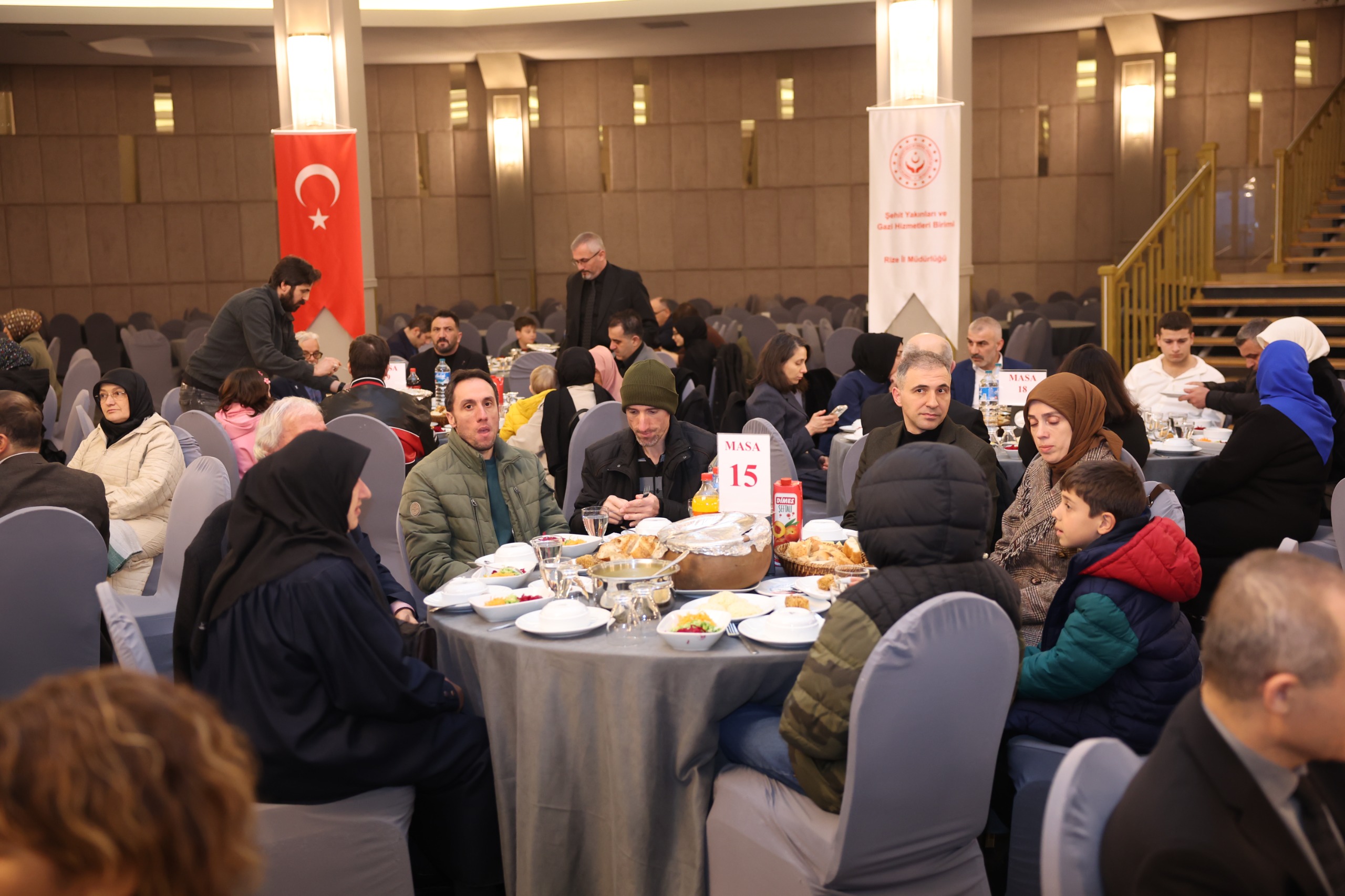 Rize Valiliği himayelerinde, Aile ve Sosyal Hizmetler İl Müdürlüğümüz koordinesinde düzenlenen programda; Ramazan ayının ilk iftarında, aziz şehitlerimizin kıymetli aileleri ve kahraman gazilerimizle aynı sofrada bir araya gelindi. Ramazan ayının manevi atmosferinde gerçekleştirilen buluşmada, birlik ve beraberlik duyguları pekiştirilerek devletimizin şefkati ve milletimizin vefası bir kez daha güçlü şekilde ortaya konuldu.