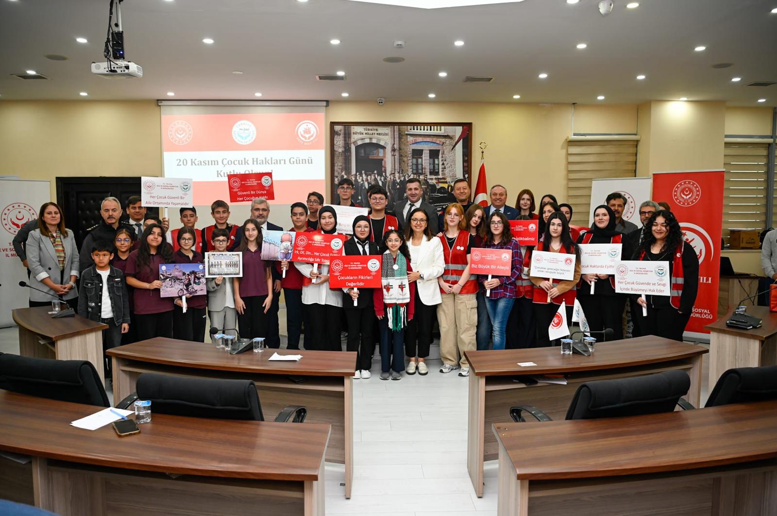 Valimiz Dr. Hülya Kaya, İl Müdürümüz Arif Laçin ve il protokolünün katılımıyla yapılan toplantı; çocukların yaşama, gelişme, korunma ve katılım haklarına dikkat çekmek, çocukların karar alma süreçlerindeki etkinliğini artırmak ve il genelindeki çalışmaların güçlendirilmesini sağlamak amacıyla düzenlendi.